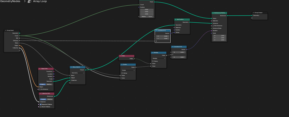 Once I established rotation as the primary motion, I introduced scaling and a small Geometry Nodes group to handle the array spin.